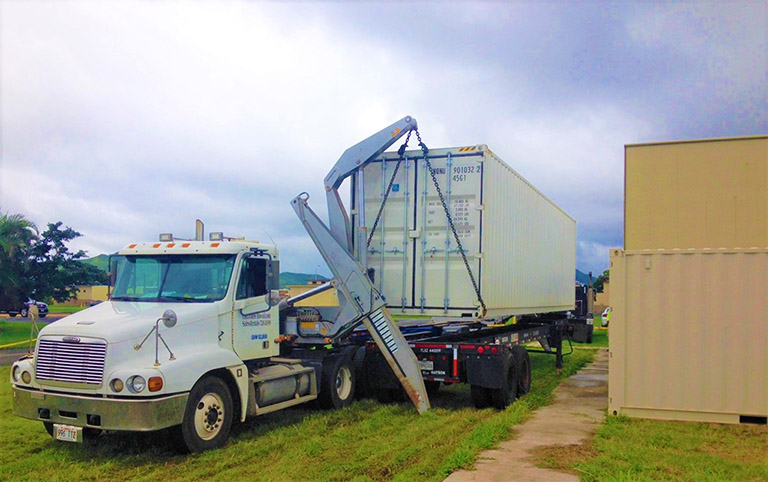 Flat-rate Delivery available on Oʻahu — Next-Day Service when needed. Sideloader Truck available for safe placement of loaded containers.